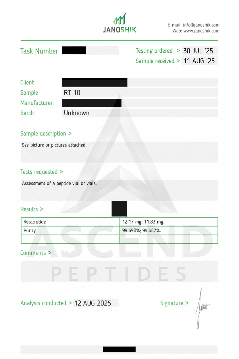 Where available, Certificates of Analysis (COAs) are sourced from independent analytical laboratories. Certain facility identifiers may be redacted to maintain confidentiality.